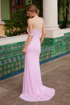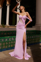 Step into soft seduction with this radiant light pink strapless sequin gown, crafted to highlight every curve and capture every spotlight. Featuring a twist-front sweetheart neckline, a sheer corset-style bodice, and asymmetrical draping across the waist, this gown exudes fashion-forward elegance. The bold thigh-high slit paired with a fitted silhouette adds a dose of glamour, while the detachable sleeve detailing adds a chic, editorial flair.