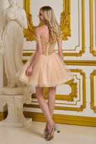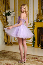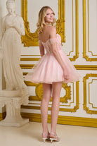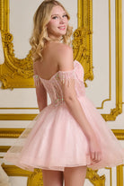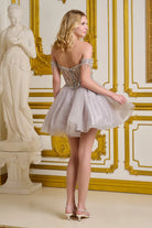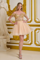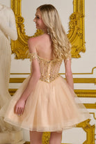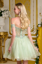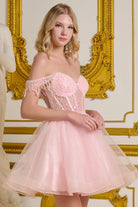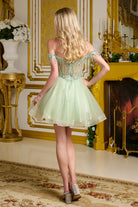 Off shoulder straps w embellished fringe trim glitter netting underlayer homecoming dress GLGS3634