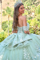 Off shoulder v neckline corset bodice cascading waist ruffles train gown with detachable back bow GLGL3815