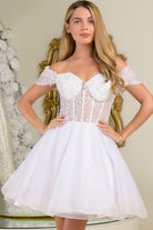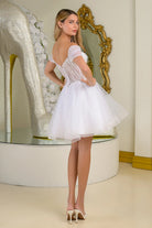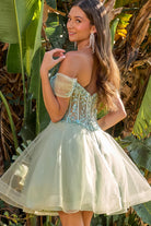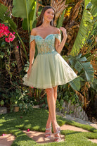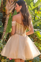 Pleated embellished off shoulder straps v neckline corset bodice a line cocktail dress with brooch GLGS3684