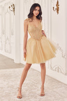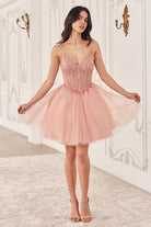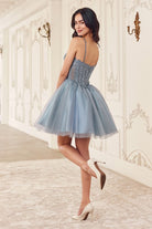 Get ready to shine in our enchanting short A-line dress, perfect for any special occasion! The embellished lace bodice features a flattering v-neckline, adding a touch of elegance to your look. With its princess cut waistline adorned with delicate lace applique, this dress accentuates your figure beautifully while exuding a romantic charm. The layered glitter tulle skirt adds a playful and whimsical element, ensuring you'll stand out on the dance floor. Thin straps provide comfort and support, while the mid open back adds a subtle yet alluring detail. Whether you're attending a homecoming dance or a formal event, this dress is sure to make you feel like the belle of the ball. Get ready to make unforgettable memories in style!