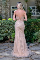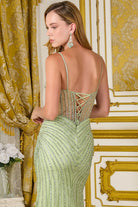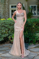 Spaghetti straps embellished boat neckline glitter underlayer fitted dress with slit GLGL3703