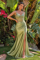 Sleek and sophisticated, this fitted floor-length evening dress features spaghetti straps and a V-neckline corset bodice adorned with sparkling beads, jewels, and sequins for a dazzling effect. A flattering Basque waistline defines the silhouette, flowing into a smooth, stretch satin skirt with artful gathering at the side and back designed to enhance. A daring thigh-high slit adds the perfect touch of drama, making this look both elegant and alluring.