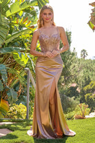 Elevate your closet with this captivating evening gown featuring beaded and sequined spaghetti straps that frame a sheer V-neckline corset bodice. Intricately embellished throughout, the bodice adds shimmer with its delicate detailing. The smooth stretch satin skirt begins at a defined waistline, highlighted by elegant crossover pleats at both the front and back. Designed to flatter, the fit-and-flare silhouette flows into a thigh-high slit for a bold yet sophisticated finish.