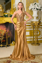 Strapless v neckline mesh corset bodice jewel dotted stretch satin slit skirt fitted dress GLGL3789