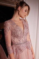 Step into timeless elegance with this stunning rose gold A-line gown, featuring a beautifully detailed sequin lace bodice with 3/4 sheer sleeves and a soft tulle skirt. The plunging neckline adds just the right touch of allure, while the peplum-style waistline cinches your figure for a flattering silhouette. Designed for weddings, formal galas, or mother-of-the-bride moments, this dress exudes grace and sophistication from every angle.