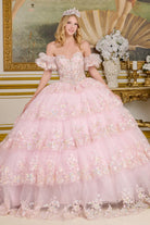 Tiered layer scallop edge bejeweled corset detached ruffle layer off shoulder sleeves ball gown GLGL3650