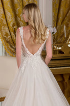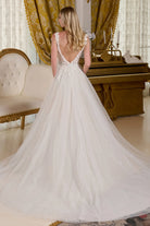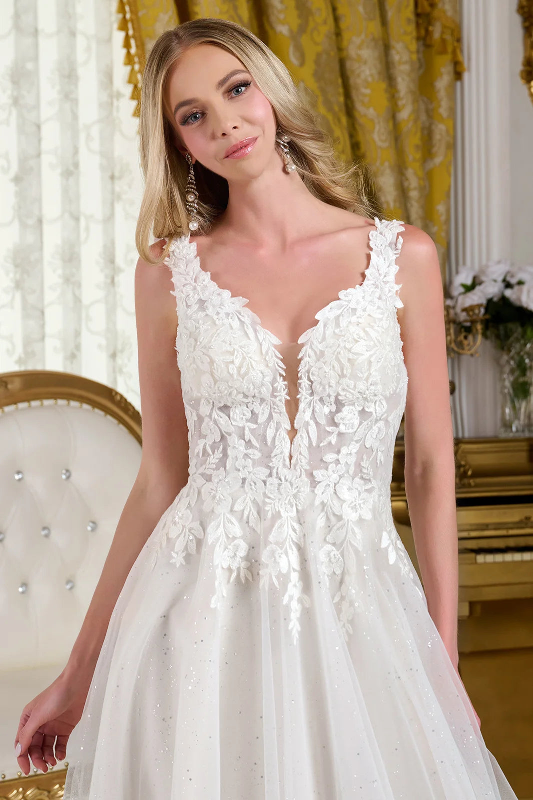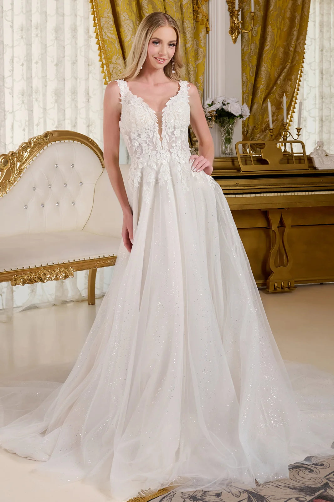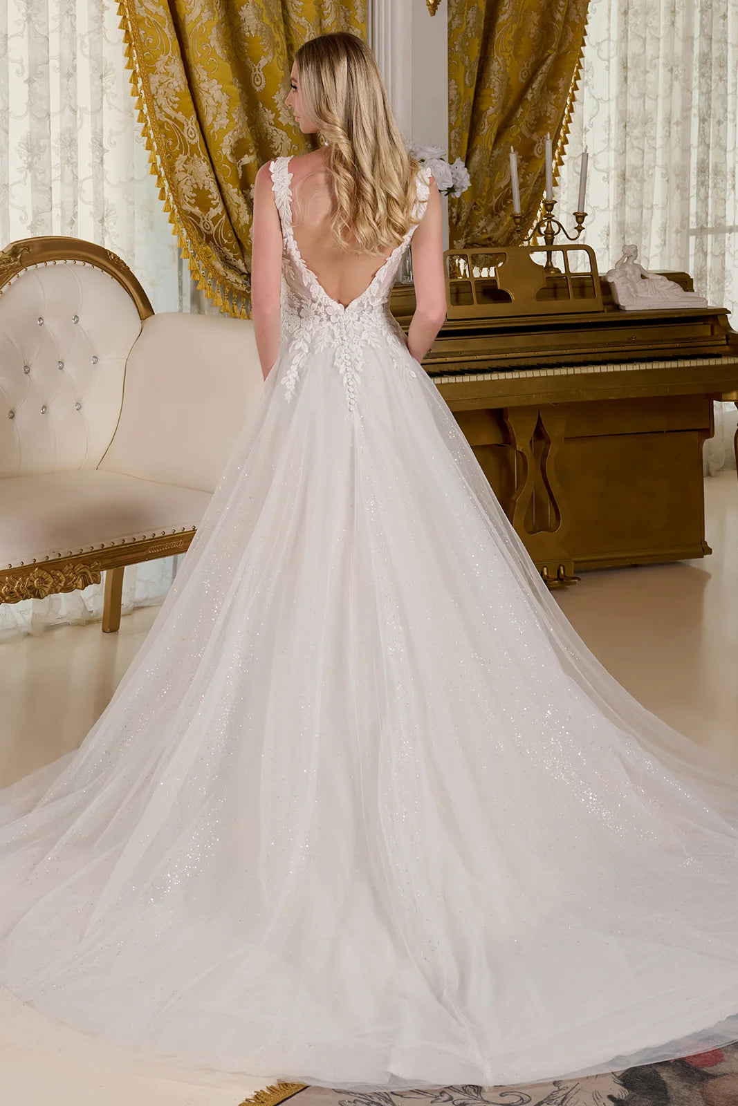 V neck embellished shoulder straps glittery underlayer low v back a line wedding gown GLGL3661