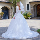 V neckline pleated stain detail long sleeves ball gown wedding train dress with short veil GLGL3820