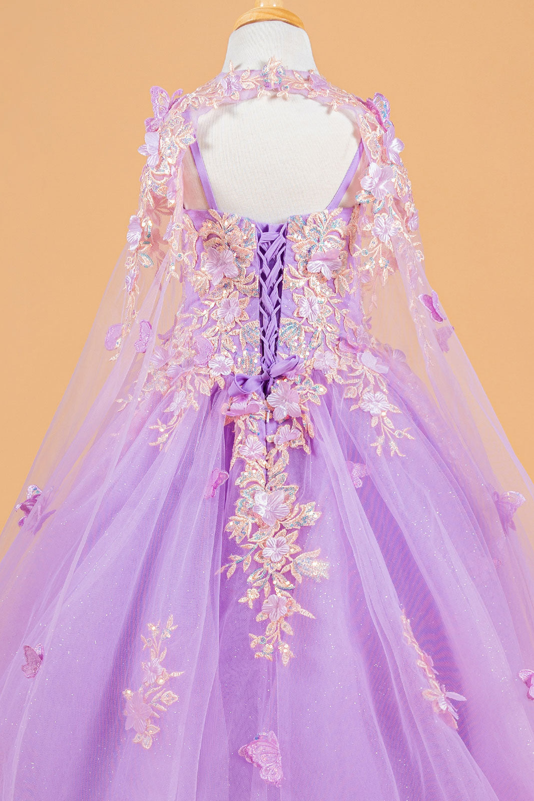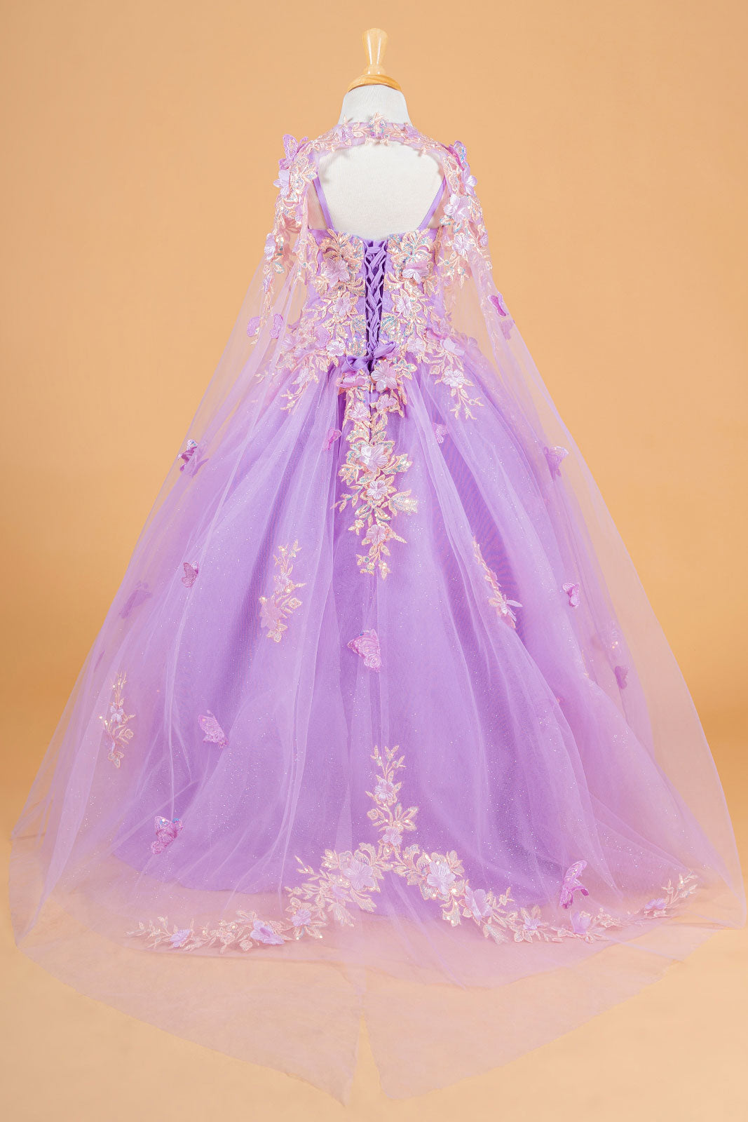 Lilac Butterfly Princess Ball Gown for Girls β 3D Floral & Glitter Embroidered Dress with Cape Overlay