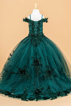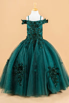 Emerald Green Girls Ball Gown – Off-Shoulder Glitter Dress with 3D Floral Appliqué GK121