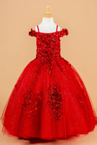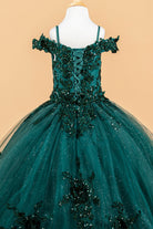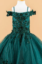 Let your little one feel like royalty in this stunning emerald green ball gown, designed for unforgettable moments. Crafted with a voluminous glitter tulle skirt and intricate 3D floral appliqués, this dress features an elegant off-shoulder neckline paired with delicate straps for extra comfort and style. The bodice is adorned with hand-placed sequins and embroidery, creating a luxurious sparkle that will shine under every light. Perfect for birthday celebrations, pageants, weddings, or any special occasion where she deserves to shine.