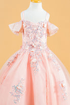 Make her fairytale dreams come true with this enchanting blush pink girls ball gown. Designed with delicate 3D floral appliqués, shimmering sequin embroidery, and a full tulle skirt, this dress radiates princess charm. The off-shoulder flutter sleeves add a touch of whimsy, while the fitted bodice offers a graceful silhouette. Perfect for flower girl duties, birthday celebrations, or any magical occasion where she wants to shine bright.