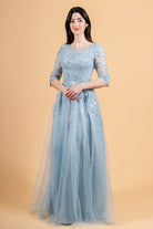 Dusty Blue A-Line Evening Gown | 3/4 Sleeve Lace Bodice Dress with Tulle Overlay | Modest Formal Dress GL3629