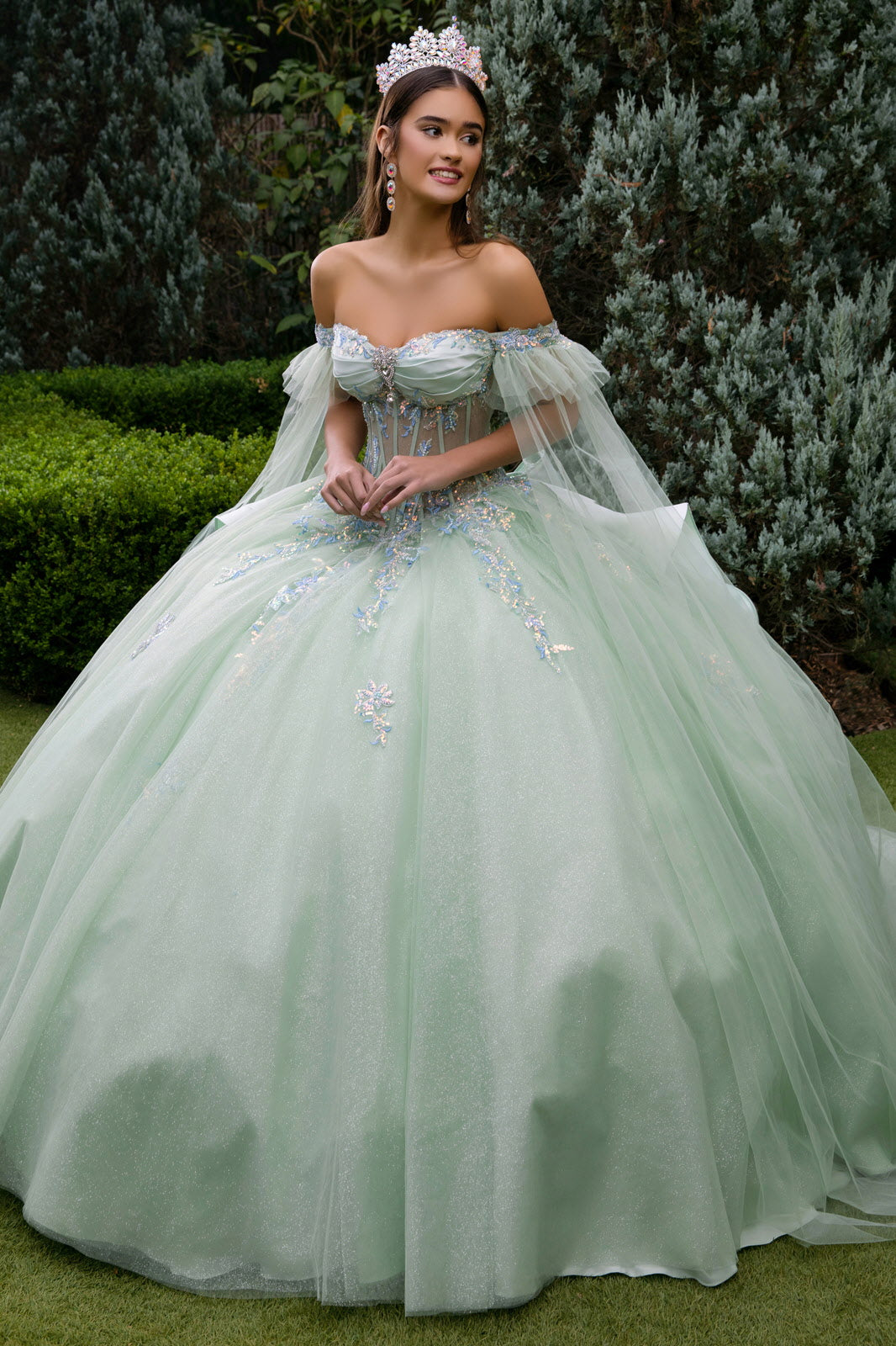 Quinceañera Ball Gown with Glitter Tulle and Beaded Off-Shoulder Cape Sleeves GL3550