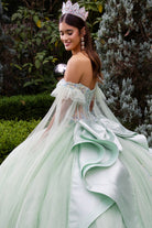 Step into your fairytale moment with this magical mint green quinceañera ball gown, designed to make you shine like royalty. Featuring a dazzling off-the-shoulder bodice adorned with intricate beadwork, pastel floral appliqués, and shimmering crystals, this gown is elegance reimagined. The structured sweetheart neckline is complemented by sheer cape-style sleeves that drape delicately over the arms, giving a romantic, ethereal feel with every movement.