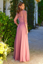 The bodice features exquisite floral lace embroidery with beaded detailing, adding just the right amount of sparkle. The illusion V-neckline and 3/4-length sheer sleeves provide modest coverage while maintaining a flattering and feminine silhouette. A soft chiffon skirt flows effortlessly from the natural waist in a classic A-line shape, with gentle pleats and a cascading overlay that enhance movement and create a statuesque look.