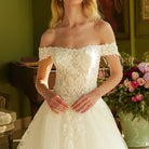 Step into your fairytale moment with this breathtaking off-shoulder A-line wedding dress, crafted to radiate timeless romance and sophistication. The corset-style bodice is adorned with intricate floral lace appliquΓ©, perfectly complemented by the sheer off-shoulder straps that gently frame your neckline. The flowing tulle skirt features rich embroidery along the hem and vertical lines, creating an elongating silhouette that's both flattering and graceful. Ideal for the modern bride seeking a balance between classic charm and refined elegance.
