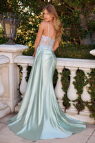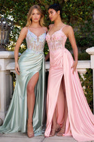Satin Gowns | Beaded Corset Prom Dresses with High Slit and Sheer Bodice CD742
