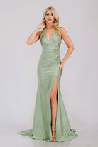 Formal Sheath Sleeveless Dress w/ Sexy Leg Slit Halter Neckline & Mid-Open Back
