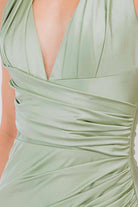 Crafted to contour your curves, the sheath silhouette promises a figure-flattering experience, while the pleated waistline adds a touch of intricate detail to enhance your natural beauty. A tantalizing leg slit allows for effortless movement and a flash of allure, and the convenient back zipper ensures a seamless fit.Β