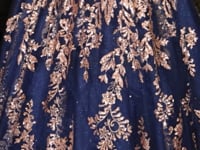 Whether you're attending a quinceañera, prom, gala, or formal wedding, this dress ensures you’ll be the center of attention. The rich royal blue base adds depth and drama, while the ornate gold embroidery delivers that regal wow factor. Lightweight for its volume and fully lined for comfort, it’s a gown made to dance, dazzle, and dominate the night.