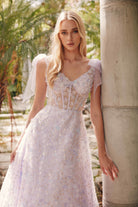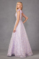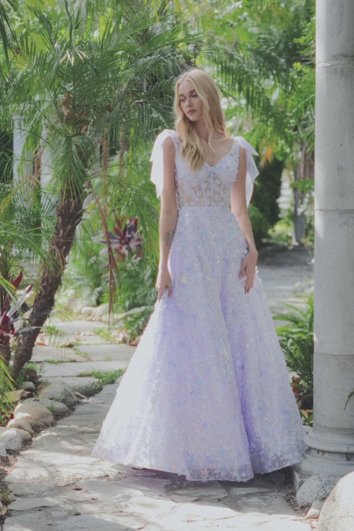 PROM A-LINE FLORAL EMBELLISHED DRESS W/ SHEER BODICE SEQUINS & LACE UP BACK