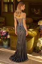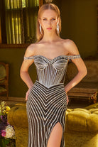 Black Off-Shoulder Sequin Gown with Silver Beaded Stripes and High Slit GL3569