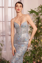 Graceful and feminine, this Dusty Blue Floral Lace Gown is designed to captivate. Featuring a deep illusion plunge neckline, spaghetti straps, and a fitted mermaid silhouette, this gown is adorned with delicate 3D floral lace appliqués and shimmering sequins throughout. The combination of soft pastel tones and glittering detail makes it a perfect pick for spring galas, proms, weddings, or red carpet occasions.