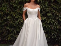 Step into timeless elegance with this off-shoulder satin bridal gown. Designed with a structured corset bodice that cinches the waist and a romantic A-line silhouette that flows gracefully to the floor, this dress is a modern fairytale come true. The off-the-shoulder neckline enhances the dΓ©colletage with soft sophistication, while the clean white satin fabric delivers a sleek and luxurious look. Perfect for brides who want a classic yet bold statement on their big day.