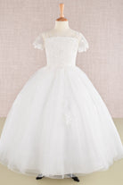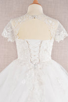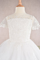 Floral Lace Embellished Bodice Short Sleeve Mesh Kids Dress with Cut-Out Back Available in Off-White