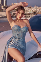 Satin Strapless Corset Gown with Beaded Bodice & High Slit – Available in Fuchsia & Ice Blue CDJ884