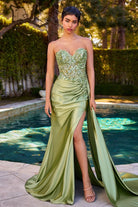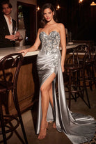 Strapless Satin Gown with Sequin Lace Bodice & Draped Overskirt CDS530