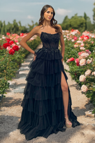 Tiered Tulle Strapless Gown with Beaded Corset and High Slit