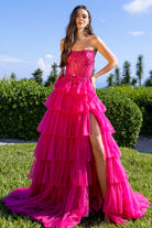 Turn heads with this enchanting strapless tulle gown, available in classic black or bold fuchsia. The structured beaded corset bodice creates a sculpted silhouette, while the cascading tiered skirt adds dramatic volume and movement. A daring thigh-high slit brings just the right amount of edge, making this dress a statement piece for prom, pageants, galas, or red carpet events. Designed to stun from every angle, this layered tulle masterpiece ensures you feel as powerful as you look.