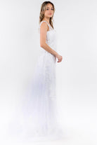 Drop dead gorgeous embroidery and sparkly jewel embellished A-line dress! It also features 3-D floral appliques and airy mesh layer attached to waist to floor.