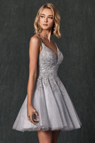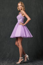 Make a statement with the Expertly Crafted Glitter Embroidered Lace Short Homecoming Dress, JT857. Adorned with intricate beadwork, this dress adds a touch of glamour to any special occasion. Available in Burgundy, Ice Blue, Lilac, and Silver, it features a flattering illusion V-neckline and open back.