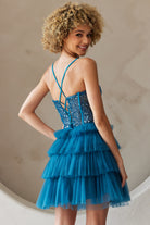 FORMAL MINI JEWEL EMBELLISHED COCKTAIL DRESS W/ LACE UP BACK & SWEETHEART NECK