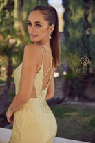 Showcasing a choice of luxurious fuchsia, lemon, and light blue shades, this long dress is designed with an illusion V-neck and a captivating open V-back in addition to the option of sleeveless or spaghetti straps.