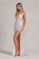Embroidered Sequins Applique Side Slit Spaghetti Straps Long Prom Dress NXD1157
