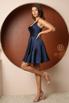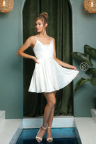 This fit & flare dress is available in navy blue, dusty blue, forest green, red, and white, and boasts a cowl neckline and an open back. With a choice of sleeveless or spaghetti straps, this is a piece of elegance for any occasion.