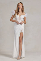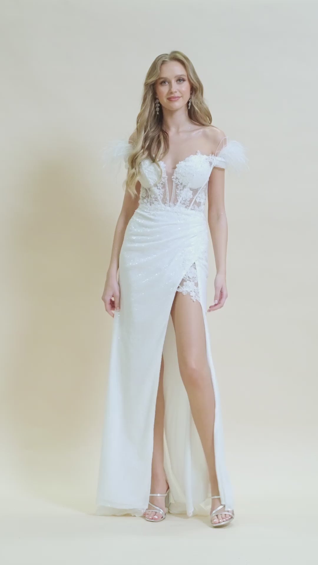 Feather Embellished Sheer Bodice Side Slit Long Wedding Dress NXS1229W