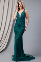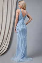 This Long Mother Of The Bride Dress features a V-Neck Illusion design embellished with a Vertical Rhinestone Pattern, making it a stunning maxi creation. Made with mesh material and available in three beautiful hues - baby blue, emerald green, and rose - this dress boasts an intricately embroidered bodice and a captivating plunge neckline at the front and back.