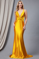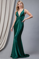 Satin Open Criss Cross Back Plunge Neck Long Prom Dress