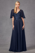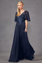 Navy Blue Sequin Bodice Chiffon Gown | Flutter Sleeve A-Line Evening Dress
