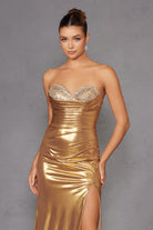 Shine bright at your next event with this glamorous metallic dress. Crafted from luxurious fabric that shimmers with every movement, this dress is designed to turn heads. The sleek silhouette is enhanced by expertly placed ruching along the back, which not only adds texture but also flatters your figure, accentuating your curves in all the right places. The dazzling bodice, adorned with intricate beadwork, catches the light beautifully, creating an aura of sophistication. Perfect for upscale events, this dress promises to make you the center of attention.