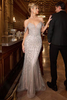 Off-Shoulder Silver Nude Beaded Mermaid Gown with Illusion Bodice CDCC0689