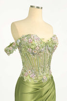Off-Shoulder Satin Gown | Beaded Corset Dress with High Slit and 3D Floral Appliqués CD745