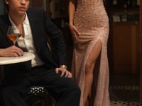 Beaded Corset Gown with Thigh Slit – Silver & Rose Gold