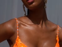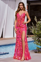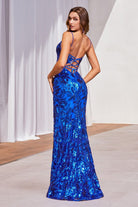 This captivating floral sequin gown is available in royal blue, tangerine orange, and hot pink. Designed with delicate spaghetti straps and a flattering V-neckline, this dress hugs the body with a curve-enhancing fit and flares slightly at the bottom for graceful movement. The shimmering sequin floral patterns create a luxurious textured look, while the thigh-high slit adds a confident, sexy twist. Perfect for prom, pageants, or any glamorous evening event where you want all eyes on you.
